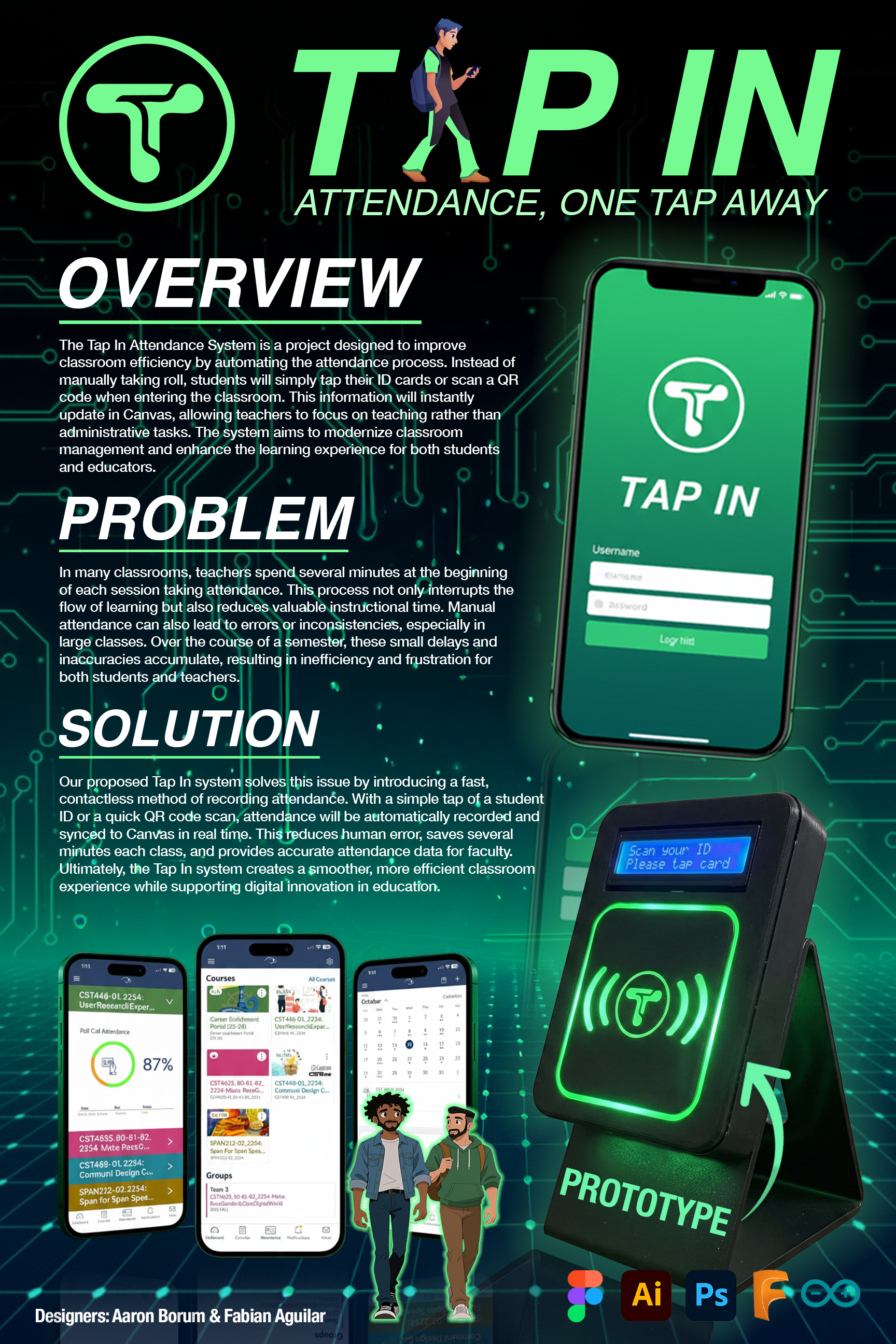 Tap In is a smart attendance-tracking app designed for college students and instructors. Instead of taking roll manually, students simply tap their ID cards or phones on a reader (or scan via NFC/QR), instantly logging their attendance.